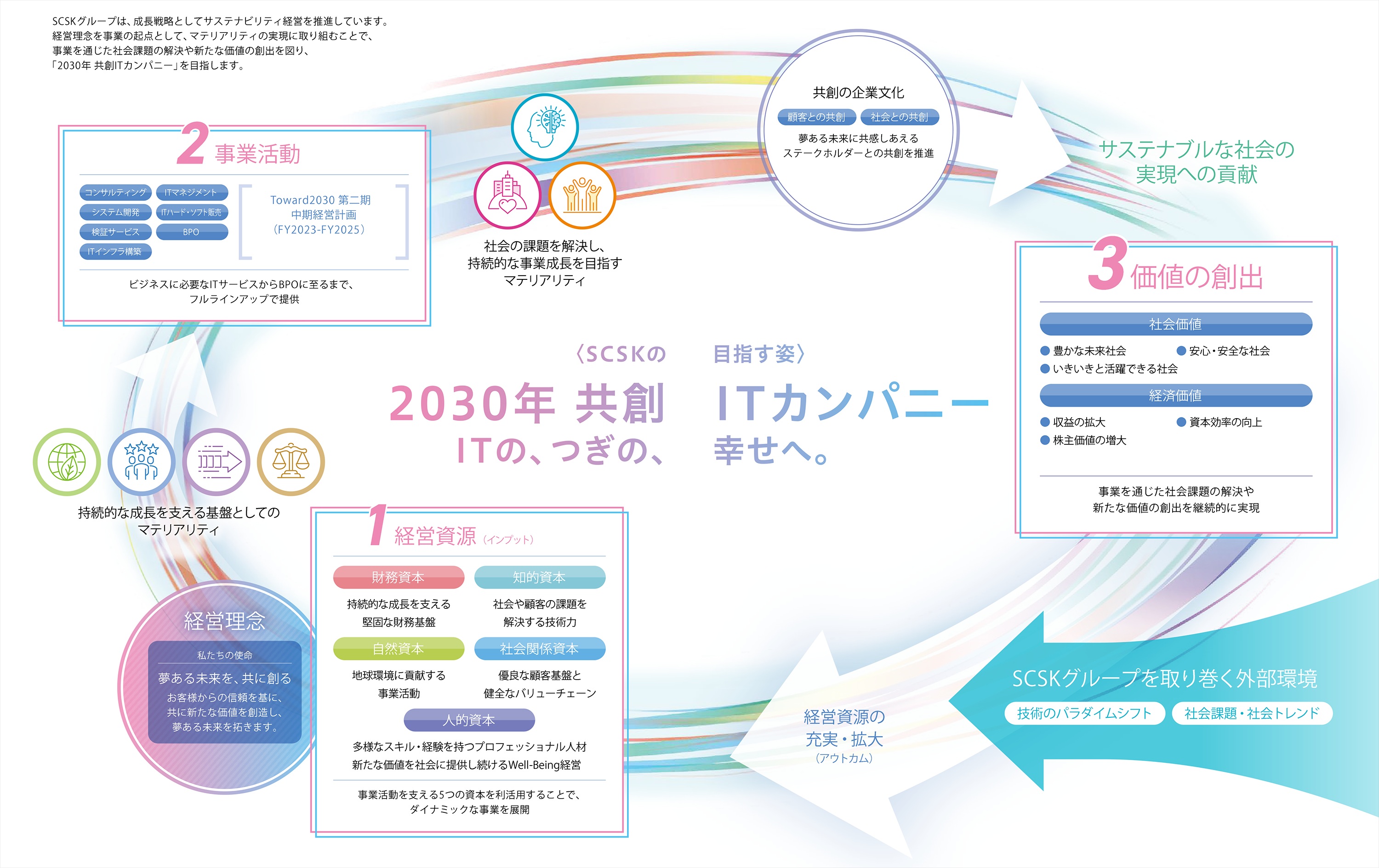 SCSKグループは、経営理念「夢ある未来を、共に創る」の下、成長戦略としてサステナビリティ経営を推進しています。