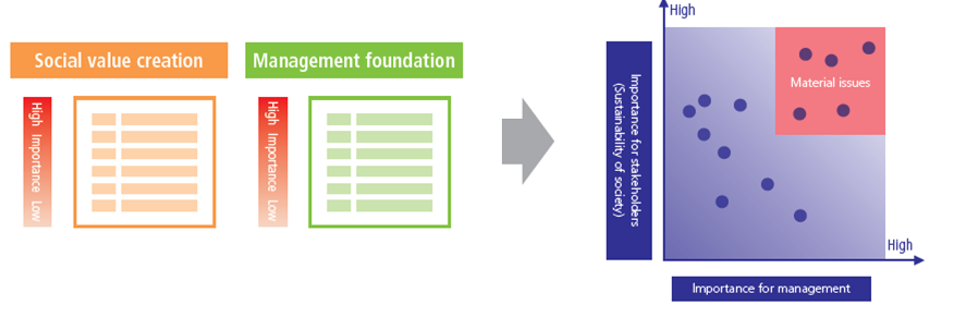 Each social issue evaluated from the perspectives of social value creation and management foundation was mapped out on a materiality matrix from the perspectives of management and stakeholders. Discussions were also held with outside experts regarding the materiality matrix and a survey of employees was conducted .