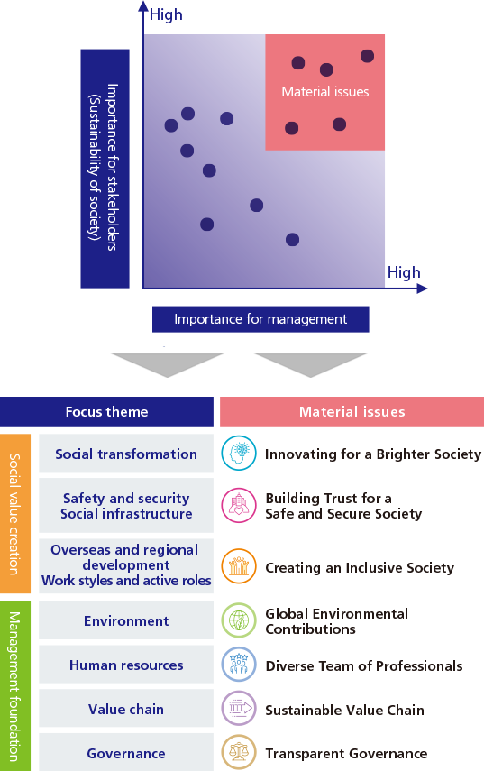 the SCSK Group evaluated a range of issues faced by society from a business perspective, seeking to achieve its corporate philosophy of “Create Our Future of Dreams,” and specified the issues that it views as particularly important and that it should prioritize taking action on to achieve growth together with society as material issues.