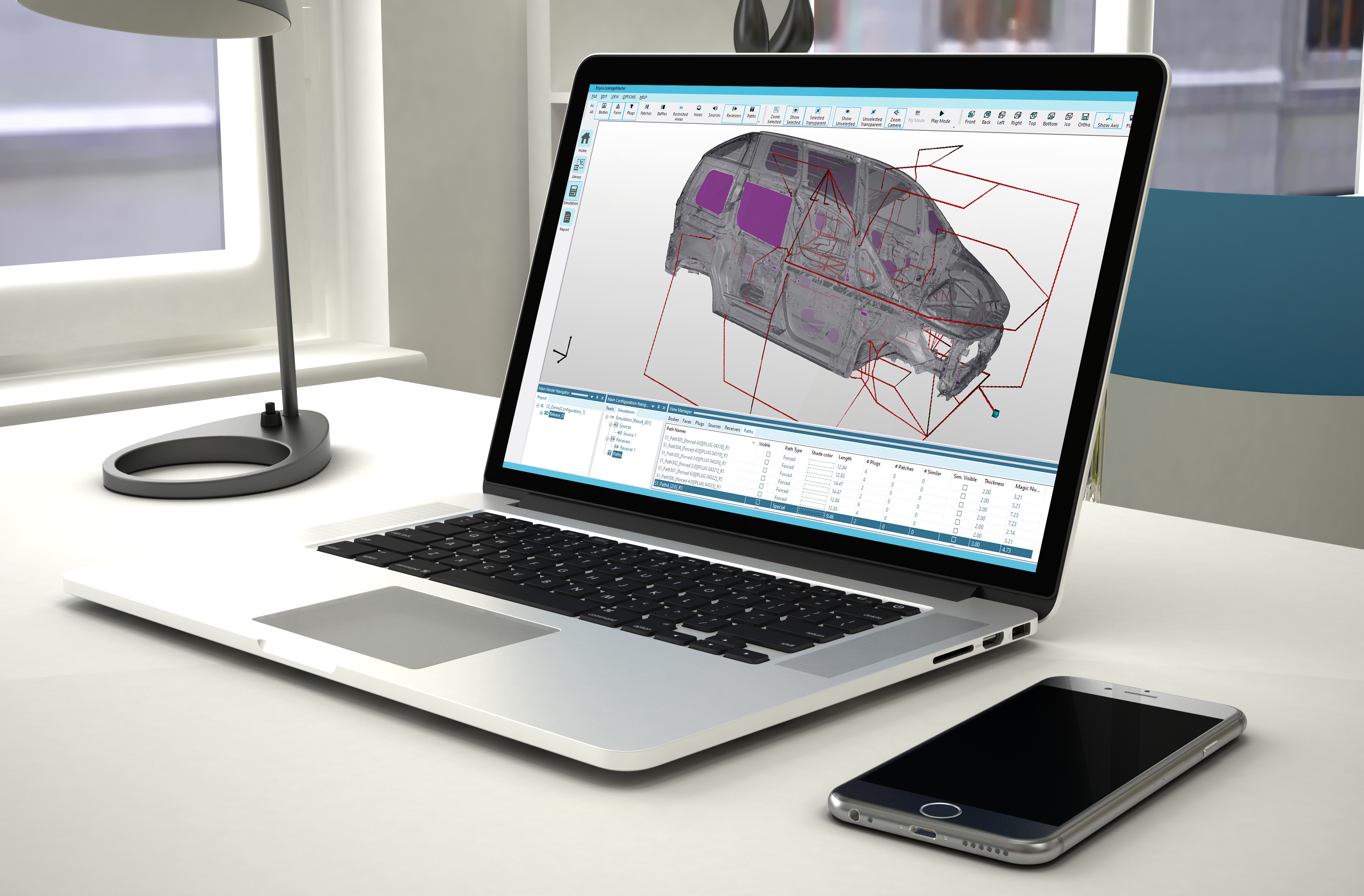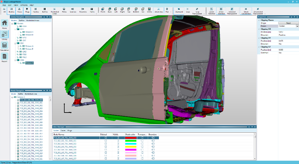 Elsyca LeakageMaster は、いままでの実験などでは簡単に解決できない問題に対応します。BIW のコンピュータ モデルから、補強構造を通る詳細な音響経路が抽出され、 この情報に基づいてエンジニアはさまざまなシーリング手段をインタラクティブに選択し、音響性能を検証することができます。