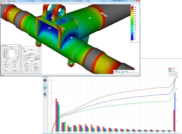 3D形状上の膜厚分布の結果表示のほか、計算結果から自動的にめっき層ごとの分布状況をグラフ化してくれますので、定性的な感覚に依らない論理的な分析を行い、改善手法を検討することが可能です。また、それぞれのめっきタイプ毎のリスクゾーン(めっき不良)を自動で表示してくれる機能も有していますので、いちいち表示基準を入力しなおしたりすることなく、同一基準にてリスク評価をすぐに行うことが可能。めっき不具合対策を素早く打つことが可能です。