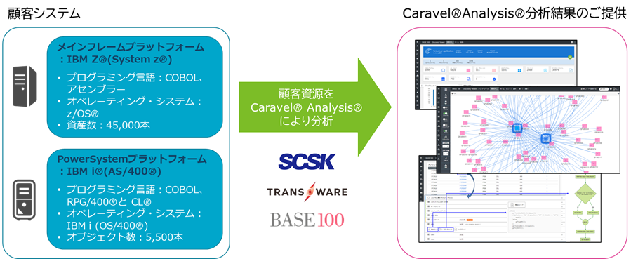 当社のメインフレームに関する各種ノウハウと、トランスウェア株式会社、BASE100, S.A.のCaravel® Analysis®を活用し、メインフレーム上の資産分析を実施いたしました。
