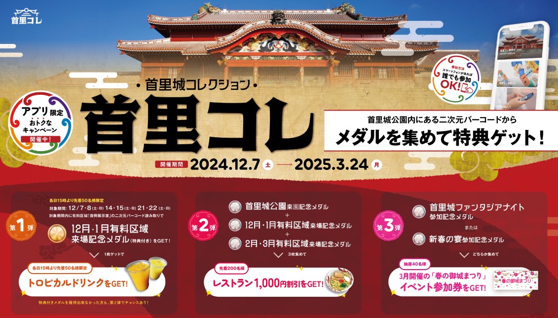 2024年12月7日(土)~2025年3月24日(月)の期間において、首里城公園にて来園者の観光体験を高め、リピート来園を促す「首里城コレクション(以下 首里コレ)」を開催します。本期間中に首里城公園にて開催予定の現地イベントとも連動しながら、特典(ユーティリティ)が付帯されたNFT※をメダルとして配布することで、多くの来園者との接点確保や関係構築・深化によりエンゲージメント向上を目指します。