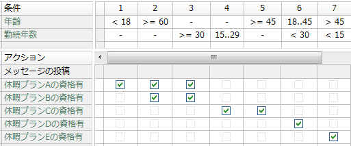 休暇日数を判定するルールでは、各プラン間での組み合わせ可・不可を考慮して加算すると、つぎのようにモデル化することができます。