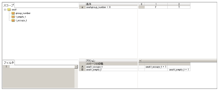 後から出てきますが、席には、着席しているグループ番号(SEAT_UNIT.group_number)を、空席の場合には-1を設定しています。これは init.ers でも設定しています。そこで空席をフィルタリングして空席の数を ->size で求め、待っているグループ(shop.group_num + 1)をフィルタリングして着席可能かどうか判断しています。プログラミング言語であれば可能な時の処理を続けて書くのですが、フィルタを設定したままでは欲しいデータを呼び出せないので、shop.judgeに着席する人数、shop.group_num に着席するグループ番号を設定します。