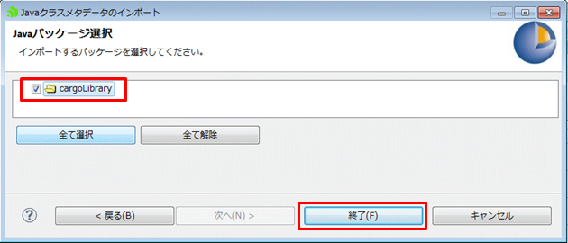 3. Javaクラスメタデータのインポート 画面で、先ほど作成した Cargo.jar を選択し、[次へ]をクリックします。