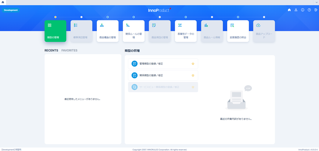 メインメニュー、サブメニュー、最近の作業履歴、最近使用したメニュー、お気に入り、システムメニューエリアで構成されます。