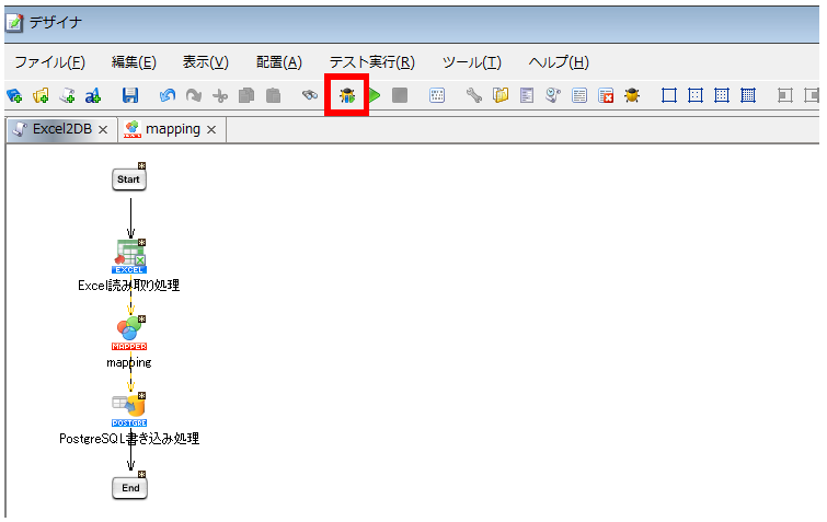 (「Start」→「Excel読み取り処理」→「mapping」→「PostgreSQL書き込み処理」→「End」の順)