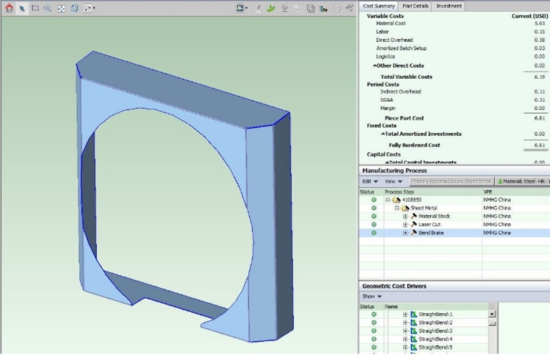 以下のスクリーンショットでは、ファンカバーの総コストの88%を材料費が占めていることがわかります。材料費を削減するために、以下の2つのアプローチが検討可能です。