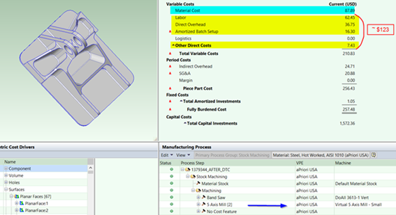 また、段取りの回数は、少量生産部品のコストに劇的な影響を及ぼします。既存の段取り方向からアクセスできない穴(aPrioriはこれを自動で特定・可視化する)があると、追加の段取り作業が発生します。