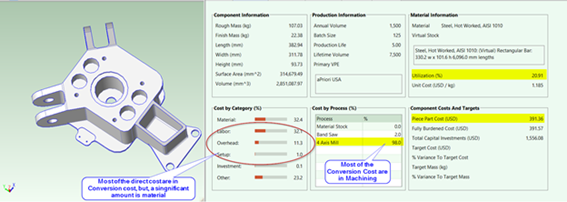製造シミュレーションを用いてコストを分析した結果、材料利用率(歩留まり)がわずか11%であることが判明しました。これは、材料4.54kg(10ポンド)につき、約4.08kg(9ポンド)が廃棄されていることを意味します。予想通り、部品製造にかかるコストの大部分は切削加工によるものでしたが、その内訳は仕上げ加工ではなく、『荒加工(粗加工)』工程に集中していました。これは、部品をニアネットシェイプ(最終形状に近い形)にまで削り出す過程が、材料費と加工費の両方で多額の費用がかかっていることを裏付けています。