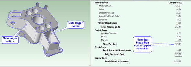 一方、以下に示す別の部品のように、荷重や疲労要件によって鋳造が選択できない場合を考えてみましょう。コスト削減の手順は同様ですが、切削コストを深く掘り下げる必要があります(部品によっては押し出し加工も検討対象になります)。