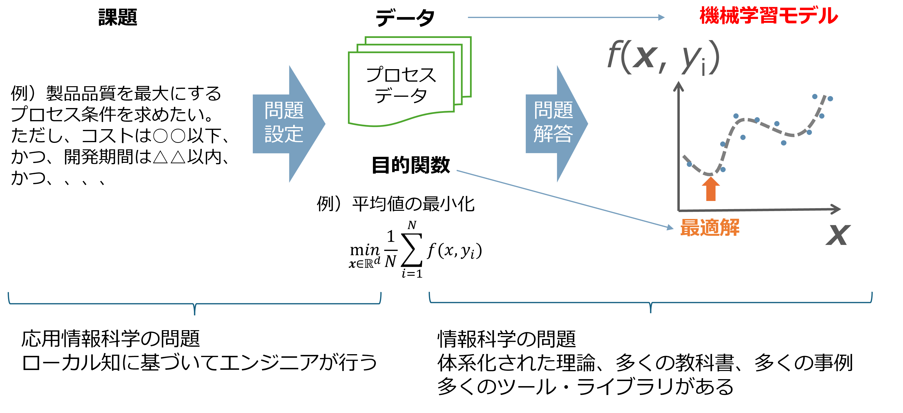 このことを別の視点から説明したものが下図です。AIを活用した課題解決のためには、まず具体的な課題を機械学習や最適化の問題に焼き直す「問題設定」が必要です。(機械学習や最適化の特徴は第2回でお話します。)課題解決のためにどのようなデータを揃えるか、最適化の目的関数は何にするか、どのような制約を与えるかといった設定がまず必要です。次に、データが揃えば機械学習モデルを作成し、目的関数に従って最適化を行います。これは与えられた問題を解く、「問題解答」に相当します。