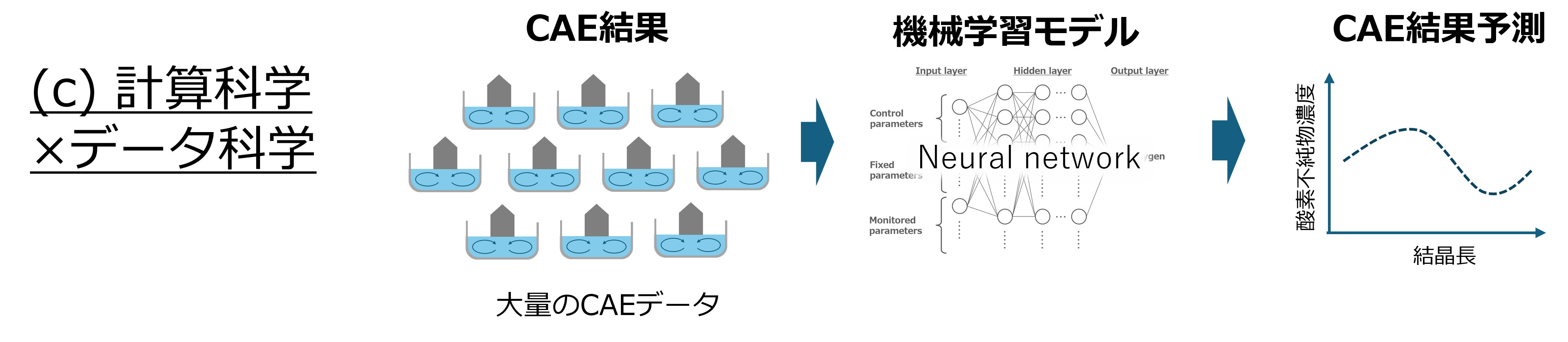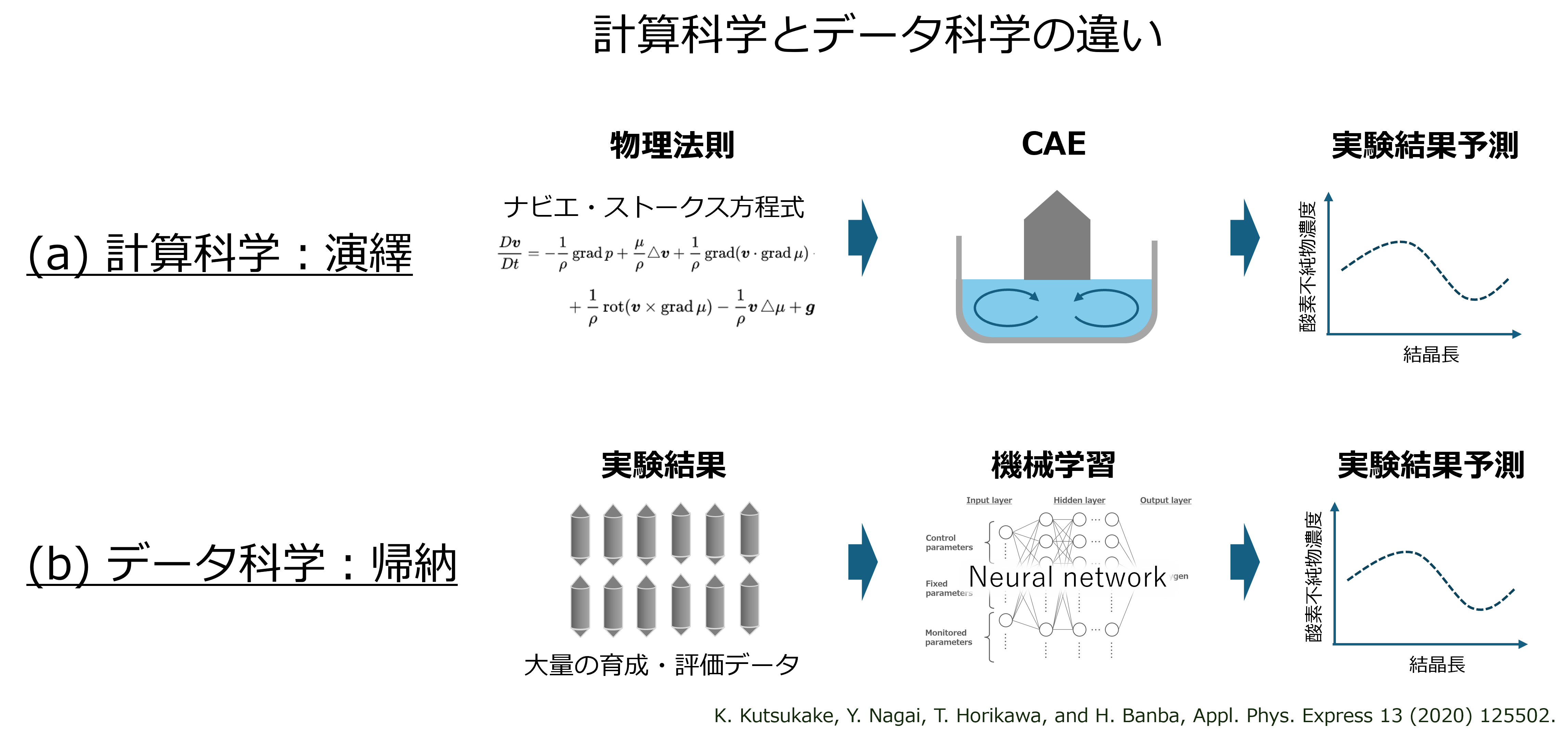 図1に、計算科学(CAE)とデータ科学(機械学習)のアプローチの違いを、半導体用シリコンの結晶育成の解析を例に表します。半導体用のシリコン結晶では、ウェハの強度や特性に影響する酸素不純物濃度の制御が非常に重要です。結晶は、チョクラルスキー(CZ)法と呼ばれる方法によって育成されます。この方法では、坩堝内に形成したシリコン融液からゆっくりと結晶を引き上げることで単結晶のシリコンを育成しますが、その過程で石英坩堝から溶解した酸素が、融液内での輸送を経て不純物として結晶に取り込まれます。この過程には、融液および周囲の気体の流れが強く影響しますので、熱流体シミュレーションによって結晶成長環境を模擬し、所与の育成条件での結晶成長実験の結果(例えば、結晶長さ方向の酸素不純物濃度の分布)を予測します。