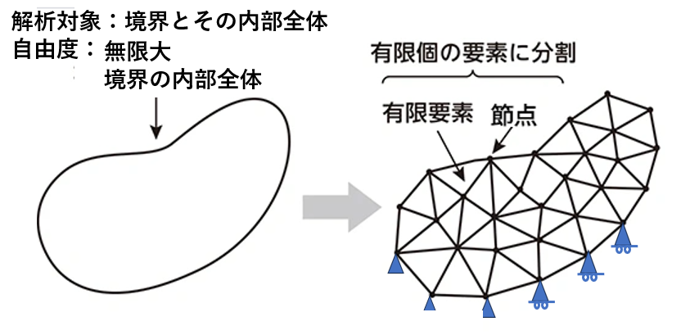 一方で、自然現象を表す支配方程式(例:熱伝導方程式、ナビエ–ストークス方程式など)は、「時間と空間のすべての点(無限の数の点)で成立する関係式」です。このことは境界条件を与えても、「解の内容」は位置と時間に関して連続的関数のままになります。言い方を変えると、境界条件を与えて空間を限定して「有限な空間内」としても、「連続無限の自由度」をもつ自然現象を対象とするということになります。しかし、現実的には無限の個数の点の情報は取り扱うことはできません。どれほど高精度・高細密な計測器が有っても空間内のすべての点を測定することはできないし、点で定義される自然現象の微分方程式を無限個の方程式として同時に解くことはどれほど優れたコンピュータでもできません。つまり解析解が存在しても計算できないことになります。また、例えば、ナビエ・ストークス方程式や弾塑性変形方程式などは、非線形性を含み、解析的に厳密な解を得ることは不可能(もしくは未知)です。したがって境界条件を与えても、「理論上の関係」は成り立つが、「具体的な値を求める(=解く)」ことは原理的に困難になります。