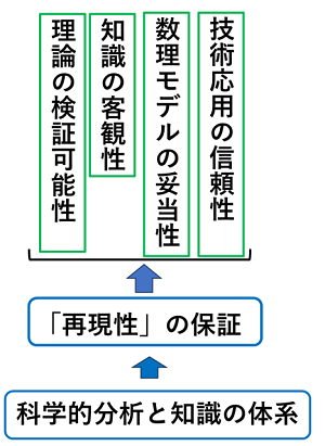 一方で、上記で述べたような科学的分析(scientific analysis)を「知識の体系」として成立させるための最も重要な条件が「再現性」の保証です。つまり「現象が個人的な経験や偶然に依存せず、客観的に確かめられる」ことを保証する性質です。再現性を必要とする項目としては、知識の客観性、理論の検証可能性、数理モデルの妥当性、技術応用の信頼性が考えられます(図3)。
