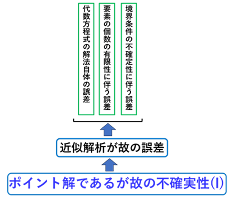 一方、①、②の誤差に基づく不確実性よりも③の境界条件の付与の不確実性の問題のほうが実際的に問題であると指摘されています。③については、もう少し広くいえば、モデルの不確実性(いわゆる境界条件(例えば、ボルト締結部の拘束性、熱伝達係数の実測困難性、接触面の摩擦状況など)、実在材料特性(例えば、規格上の同一種のヤング率であっても固定的ではないこと)、外力条件(振動入力の周波数分布の想定困難性など)の不確実性のことをいう)ともいえます。このように境界条件不確実性に関してはいくつかの指摘はできますが、その本質的な問題は次の2点にあると思います。