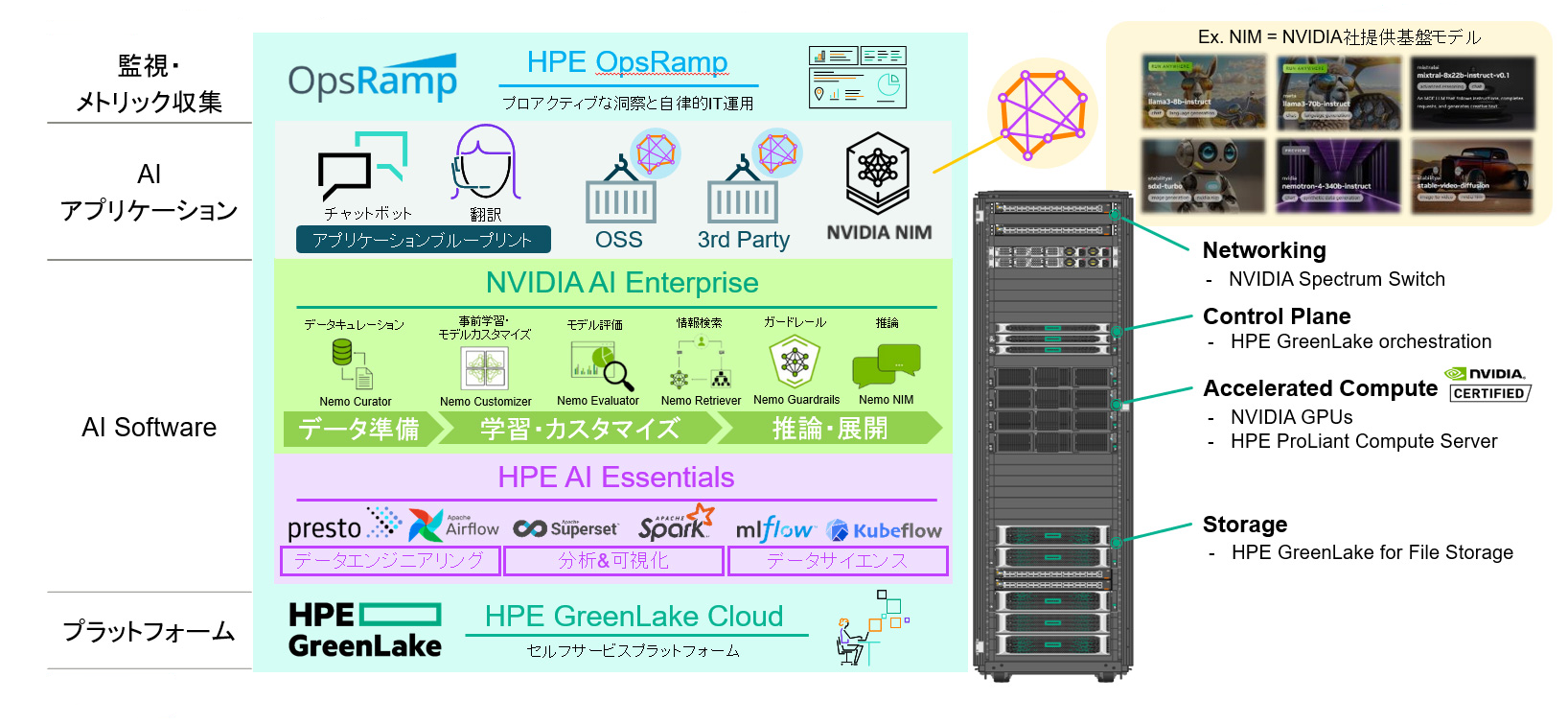AIモデル(NIM)、AIソフトウェア(NVIDIA AI Enterprise、HPE AI Essentials)、AIハードウェアをワンストップでサポートできます