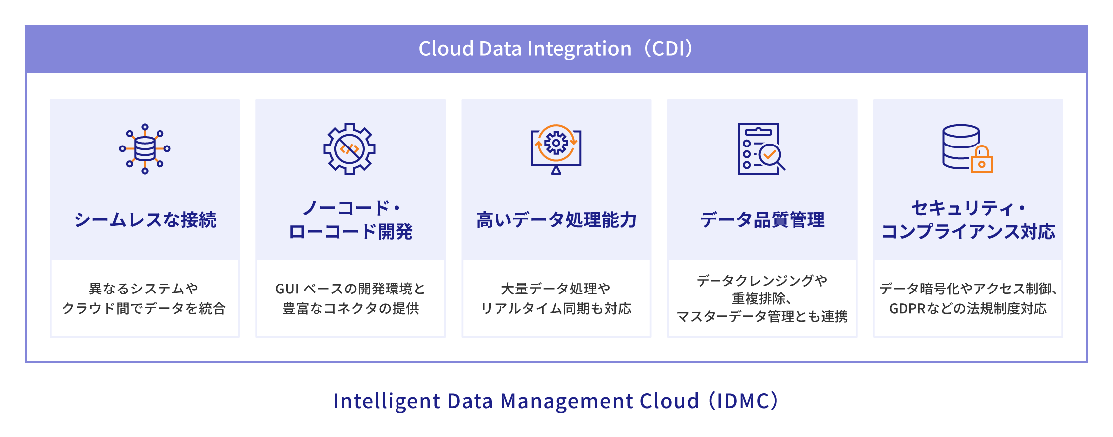 CDIとは、インフォマティカが提供するIntelligent Data Management Cloud(IDMC)の一部として提供されるデータ統合ソリューションです。異なる環境に散在するデータを、安全かつ効率的に接続・変換し、統一されたデータの管理を実現します。シームレスな接続、ノーコード・ローコード開発、高いデータ処理能力、データ品質管理、セキュリティ・コンプライアンス対応といった機能を備えており、データ活用による企業の迅速で正確な意思決定に貢献します。