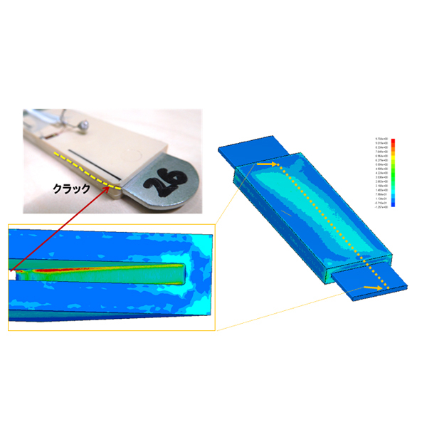 ADVENTUREClusterは、他の解析ソフトウェアと連携しやすいため、流動解析と連成させて熱応力解析を実施することが多いです。例えば、ガラス強化材を使用した製品では、繊維配向による異方性があるため、これを考慮して構造解析を行う必要があります。そこで、樹脂流動解析結果の繊維配向情報をADVENTUREClusterモデルにマッピングして熱応力解析を行うことで、材料特性の異方性を考慮した応力や変形を評価しています(図1)。同様の手法で、金属をガラス強化材に挿入した部品で行った事例が図2です。こちらは、高温での焼きなまし処理では割れが生じないものの、極低温環境ではクラックが発生しました。これも解析では最大応力位置で再現されており、高い予測精度が確認できたため、お客様の製品に対する解析サポートに活用しています。