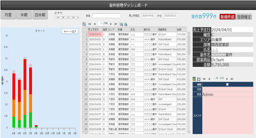 MotionBoard独自の入力機能を用いて案件の新規登録を行うことができます。登録されたデータは中央の案件リストに反映されます。また、リストから任意の明細を選択すると、コメントを残すことができます。登録された案件は縦積棒グラフで確度ごとに表示することも可能です。