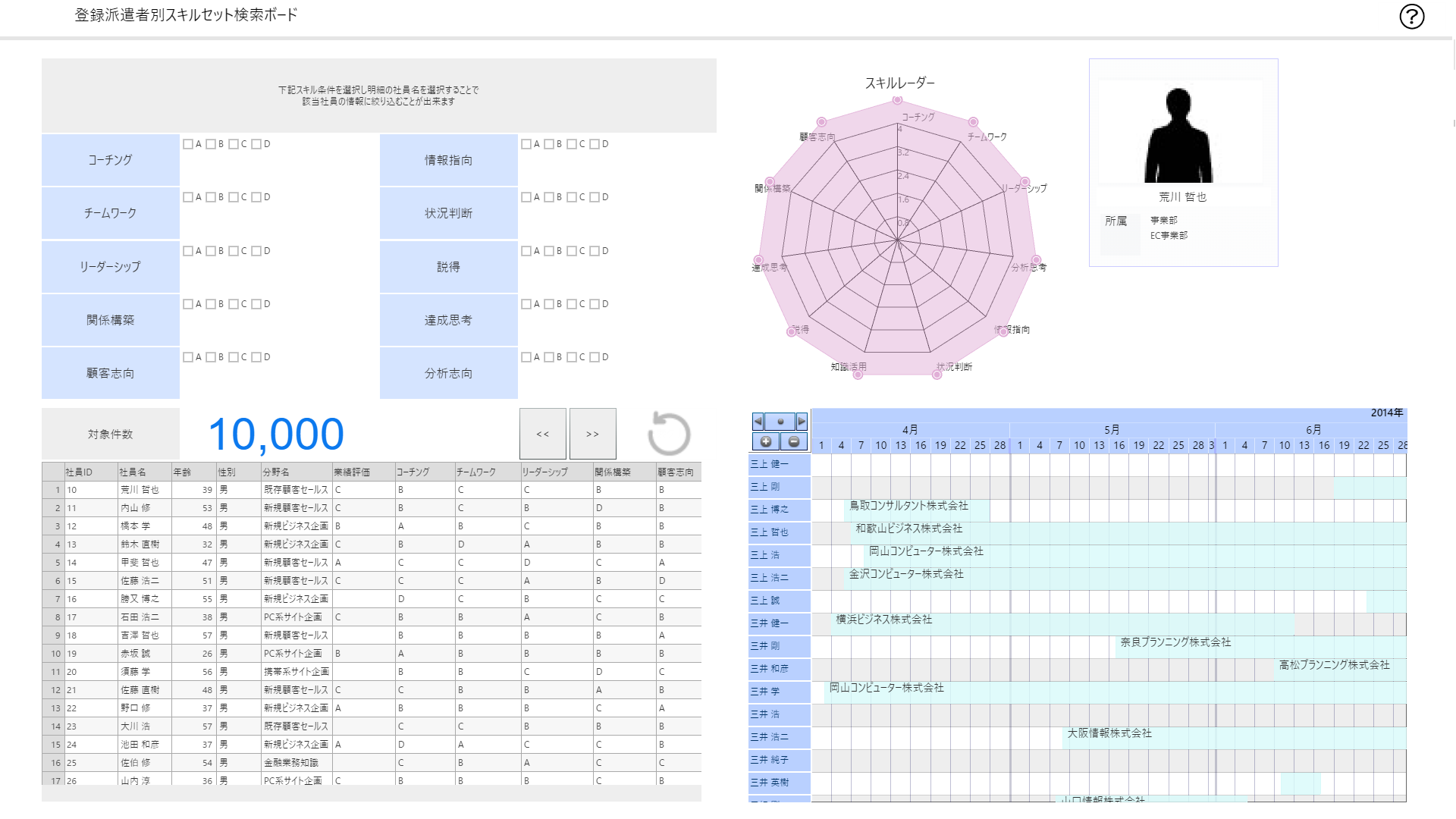 該当社員のスキルをレーダーチャートに表示し、現在派遣されているかどうかと言ったスケジュールの確認もできます。