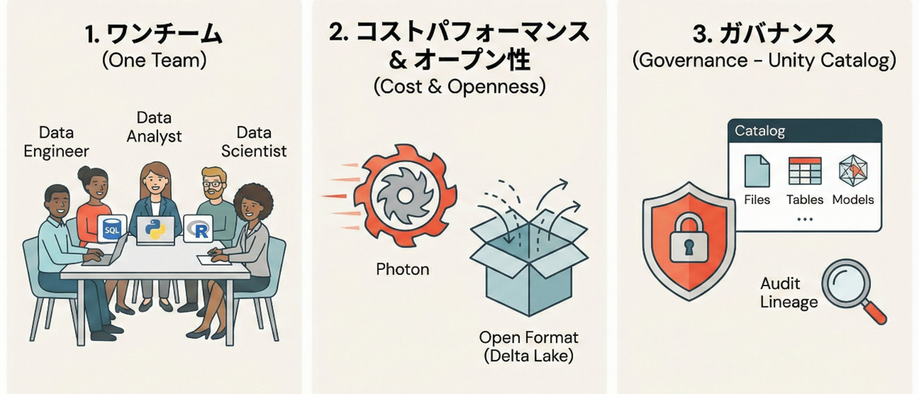 DatabricksはオープンソースのApache Sparkを源流としており、独自の高速化エンジン「Photon」を搭載しています。これにより、大量データの処理において驚異的なスピードとコスト効率を実現します。 また、Databricksが採用しているデータ形式「Delta Lake」はオープンフォーマットです。特定のベンダーにデータがロックインされる心配がなく、将来にわたって自社の資産としてデータを保持できる点は、長期的なIT戦略において極めて重要です。