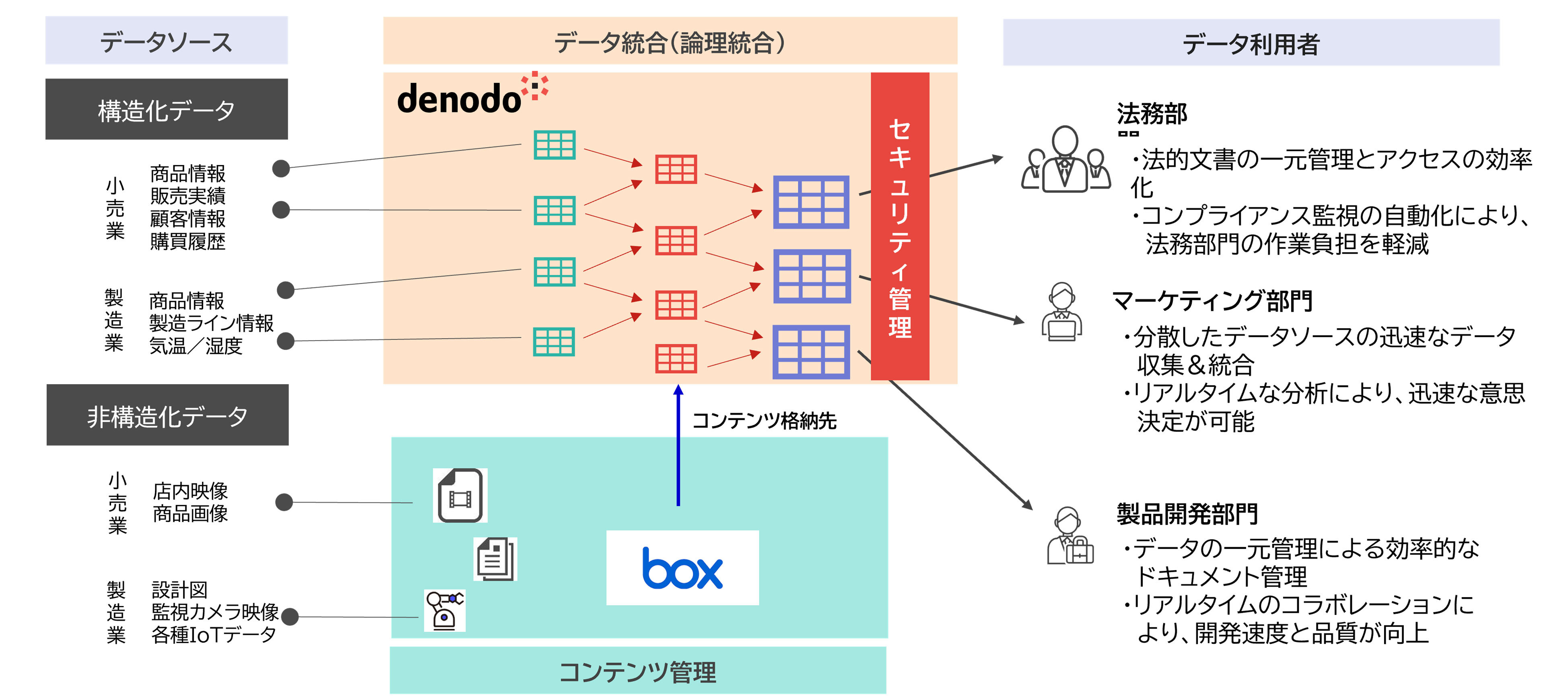 構造化データ(商品情報など)はそのままDenodoで直接論理統合し、非構造化データ(店内映像や設計図など)はコンテンツ管理に長けたBoxを通してDenodoへ連携させます。最後にDenodoが持つ強力なセキュリティ管理機能を通すことで、安全なデータ提供を実現します。