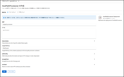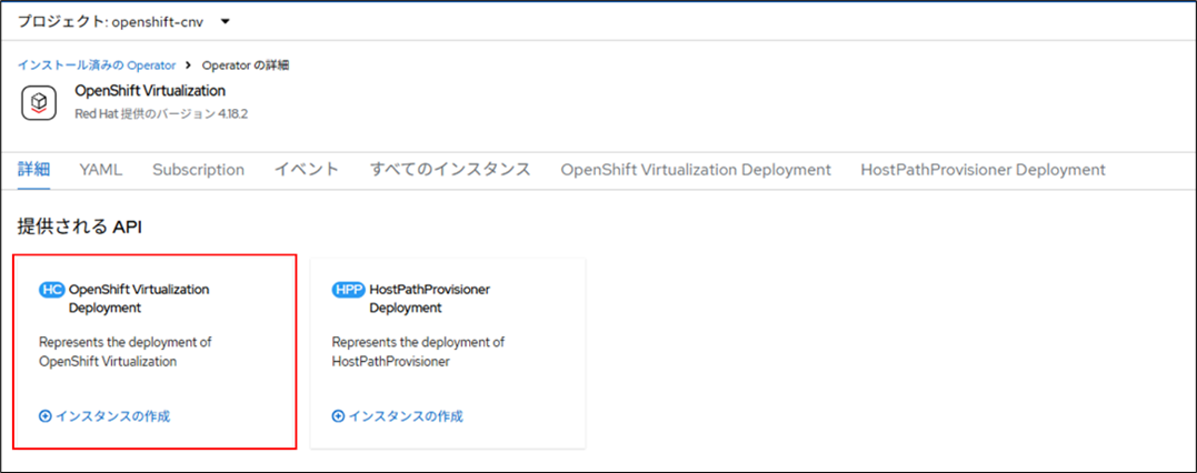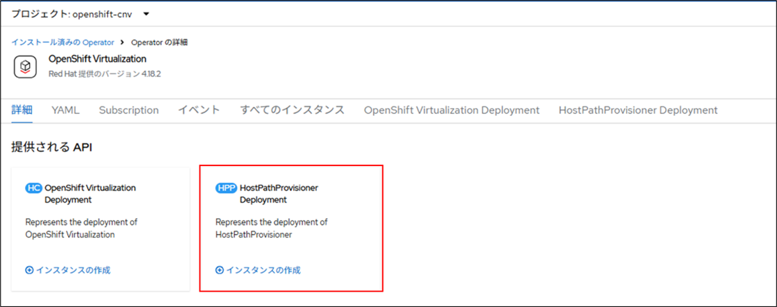 1.Webコンソールのメニューから「Operator>インストール済みのOperator > OpenShift Virtualization」を選択して表示される画面上の、HostPathProvisioners Deployment の[インスタンスの作成]をクリックします。