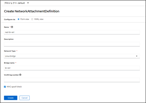3.パラメータを入力し、[Create]をクリックします。今回はdefaultのプロジェクトに作成します。defaultのプロジェクトに作成すると、すべてのネームスペースのVMでNADを割り当て可能です。