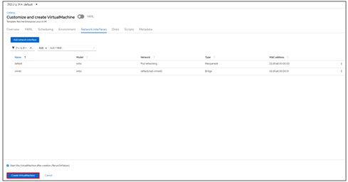 5.[Create VirtualMachine]でVMを起動します。仮想マシンがVM専用ネットワークのみを使用する場合はPod networking用のNICは削除しても問題ありません。