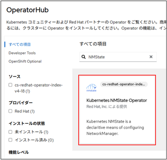 2.検索バーに「NMState」と入力し、「Kubernetes NMState Operator」を選択します。
