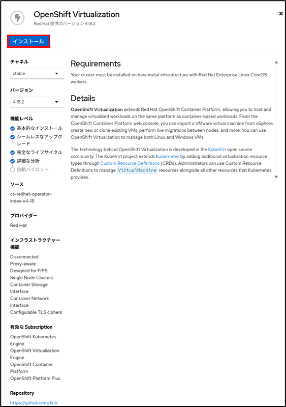 まずは、OCP-Virtを使えるようにするためのOperatorをインストールします。