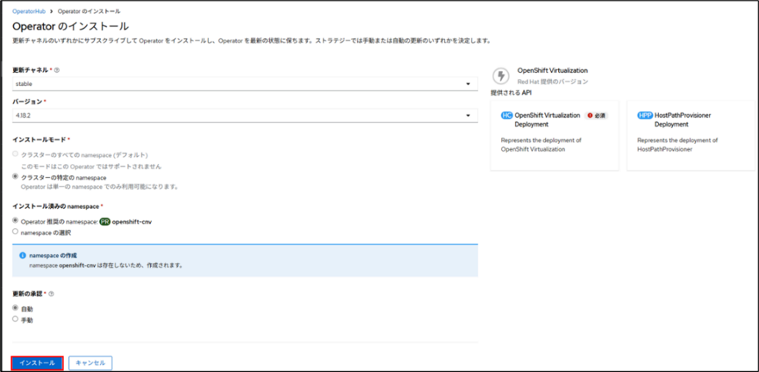 - インストール済みのnamespace:Operator推奨のnamespace:openshift-cnv