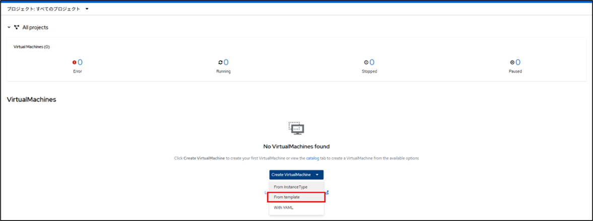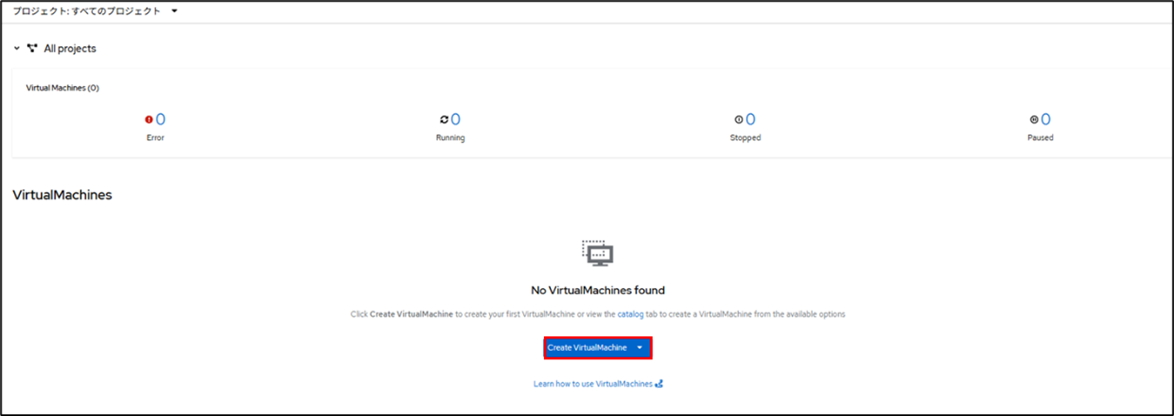 2.OpenShiftにログインし、左メニューから「Virtualization」→「Virtual Machines」を開きます。