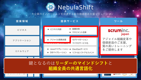そこで、SCSKのNebulaShiftであれば組織変革からアジャイル導入、ソフトウエア開発、基盤構築まで、高度な知識を持ったコーチやエンジニアによる様々なサポートを受けることができます。Scrum Inc. Japanと共に、新規事業に欠かせない組織・現場・システム基盤のすべての領域で新規事業、アジャイルへの挑戦をご支援します。