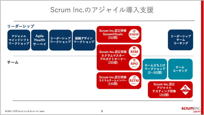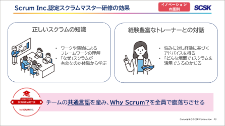 企業全体が新たな働き方へ向かうためには、まずはスクラムチームとマネジメント層の連携チームであるパイロット組織を立上げ、成功モデルを確立し、全体へと拡大していく方法が望ましいです。一方で、既存事業も行いながら働き方を変えていくことは容易ではありません。その際、組織変革の鍵となるのはリーダーのマインドシフト、組織全員の共通言語化です。Scrum Inc. Japanでは、SCSKが提供するNebulaShiftにおいてアジャイルな組織への変革支援と、マネージャーやメンバーのマインドシフトと共通言語化を強力に推進するための認定資格研修や各種ワークショップを提供しています。お客様の本質的な学びと組織変革を支援することで、ビジネスアジリティを向上させ、成功の可能性を高めていきます。