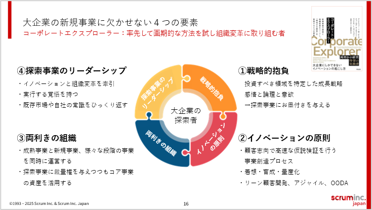 そこで新規事業を育て、企業を成長させていくには『コーポレート・エクスプローラー ――新規事業の探索と組織変革をリードし、「両利きの経営」を実現する4つの原則』(アンドリュー・J・M・ビンズ 他, 2023)に示されている4つの要素を意識することが重要です。