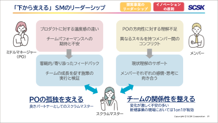 また、スクラムマスターは、プロダクトオーナーに対しては対等なパートナーとして、メンバーに対しては迷ったときの拠りどころとして、1on1等による支援を常に行っていました。このサーバントリーダーとしての関わりがチームの良い関係性を生み出し、イノベーションを生み出す要因となっていました。