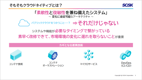 「SCSKのふるさと納税」でもコンテナ、マイクロサービス、DevOpsといった技術要素や考え方が用いられ、変更頻度の高いユーザー向けの発信や機能追加が柔軟にできるようになっています。しかし、最新のクラウドネイティブ技術は日々進化し続けておりキャッチアップは容易ではありません。