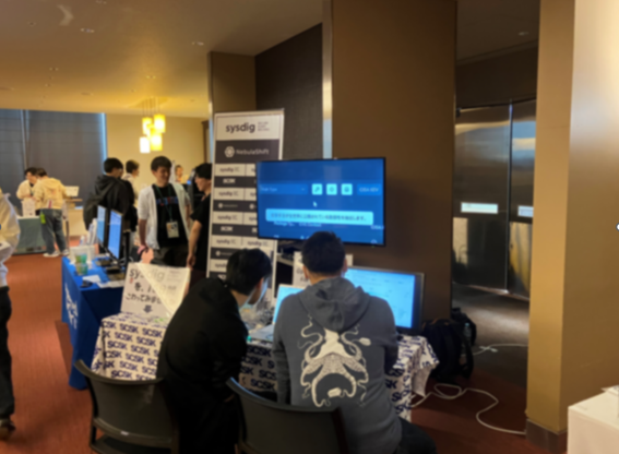 当日のブースの様子です! 「コンテナやクラウドのセキュリティに関わる方々に、気軽にSysdigを触ってみてほしい」という思いから、昨年に続き、Sysdigを実際に操作できるデモコーナーを設置しました。