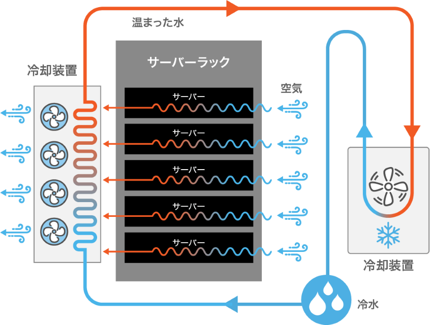 コールドプレート型冷却は、リアドア型冷却よりも高い冷却効率を実現できますが、サーバー自体がコールドプレート型冷却に対応した水冷サーバーである必要があります。