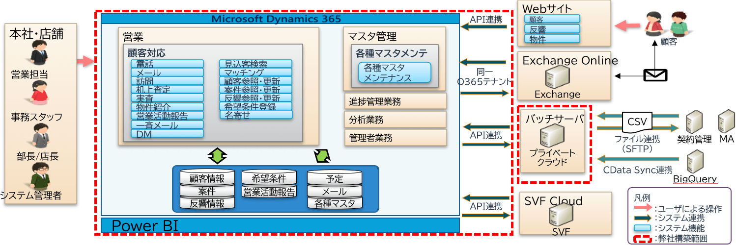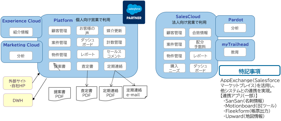 営業担当者向け機能の提供(希望物件マッチング(自動メール送信、他社物件含む)、行動管理(Outlook連携)、顧客連絡先連携(iPhone)、売物件査定支援、契約付帯書類作成)、未媒介物件管理