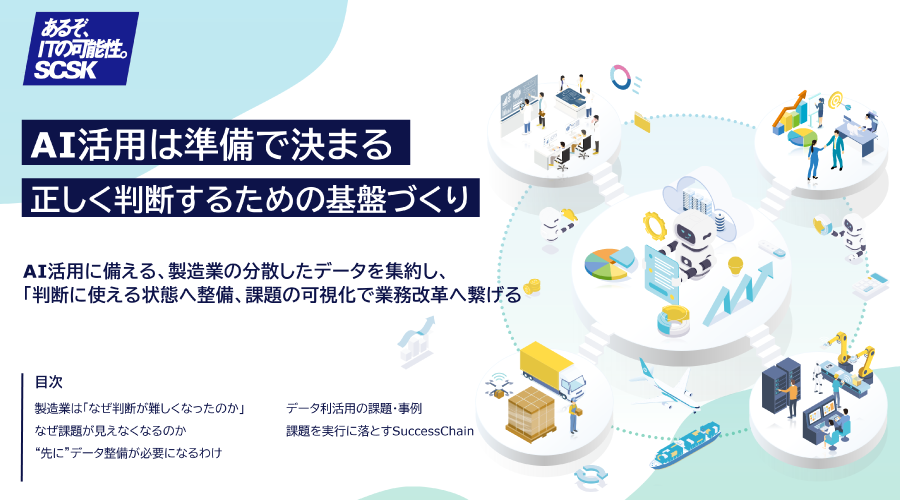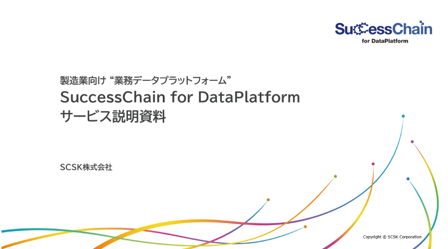 SCSKが提供する製造業向けサービス「SuccessChain for DataPlatform」は、製造業の各工程・各システムに分散するデータを統合・可視化し、サプライチェーン全体に潜む“気づき”や“隠れた業務課題”を明らかにする「業務データプラットフォーム」です。