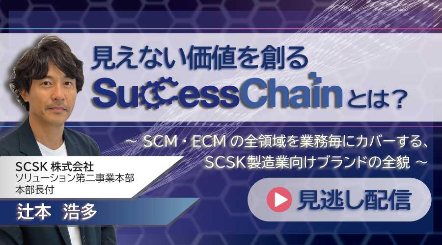 本セミナーでは、SCSKが提供する製造業向けの新ブランドSuccessChainについてご説明しております。 SuccessChainブランドの説明に加え、そのサービス郡であるfor Dataplatform及びfor ECMについて製造業の現場においてどのようにご活用いただけるかをイメージいただける内容となっております。是非、製造業のDXを加速させるヒントとなれば幸いです。