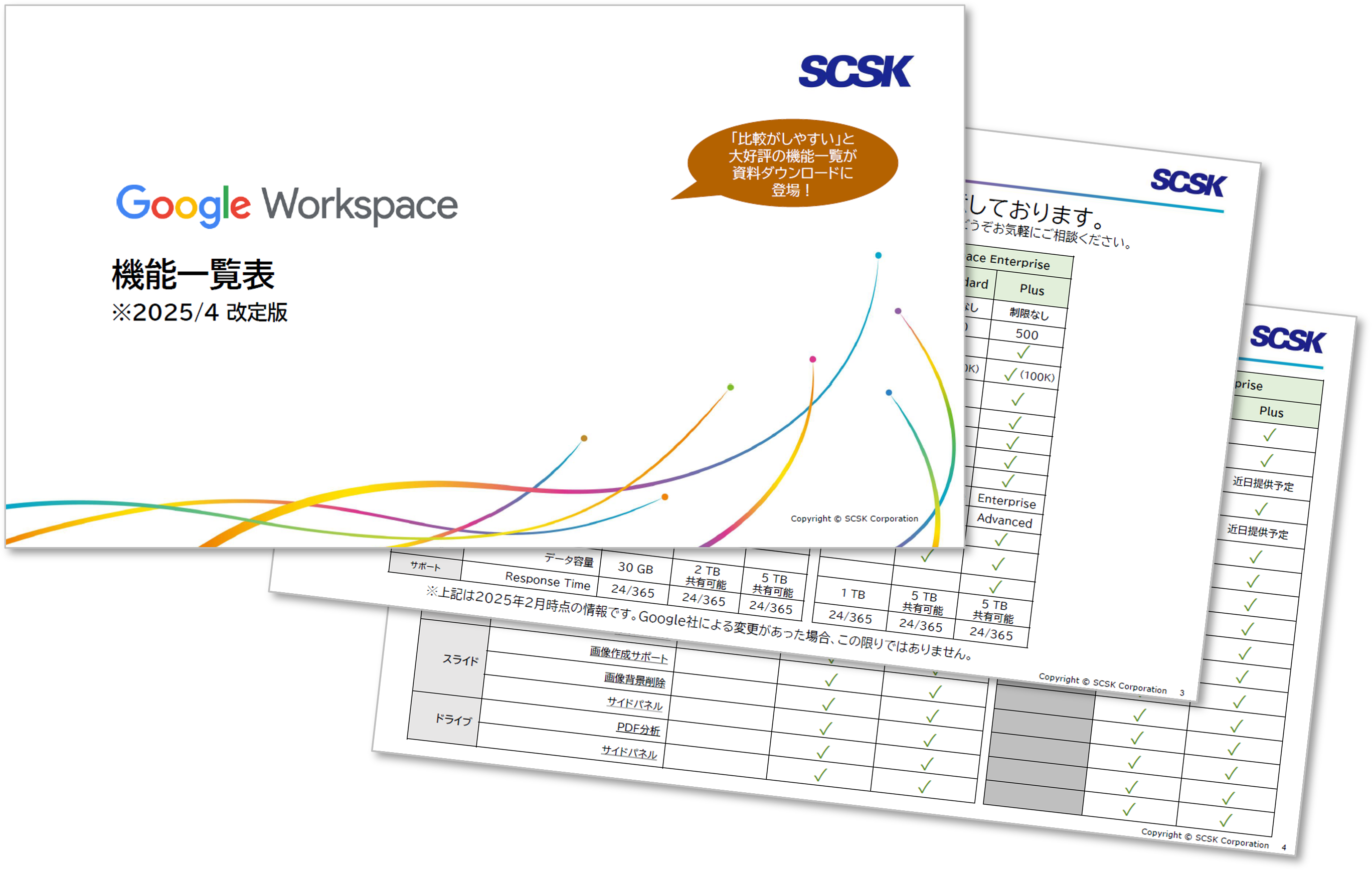 Google Workspaceの全体機能および最新のライセンス体系に加え、生成AI「Gemini」の統合によって強化された機能を一覧でご紹介する内容となっています。これにより、Google Workspaceをより手軽かつ効果的にご活用いただけるようになります。