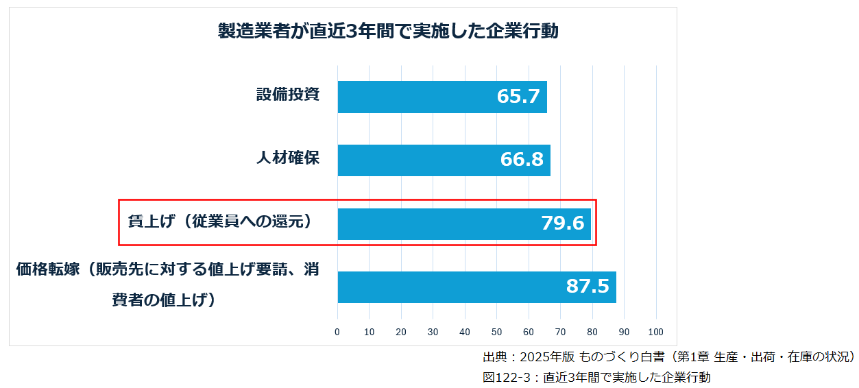 また、人材確保のために、約8割の企業で賃金の引き上げが行われています。しかし、特に中小企業では「人材確保」と「コスト抑制」の両立が難しく、結果として生産ラインの安定稼働や納期維持にも影響が出始めています。