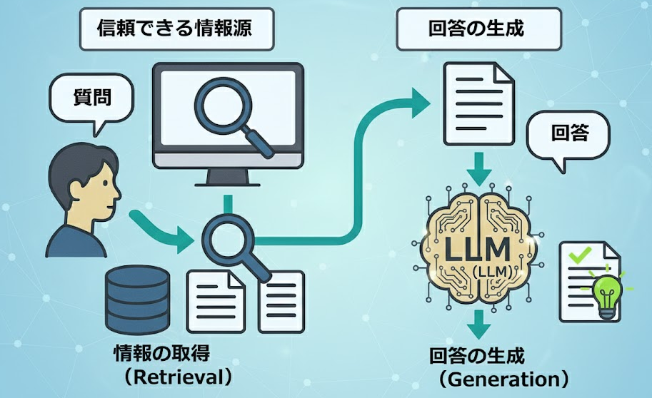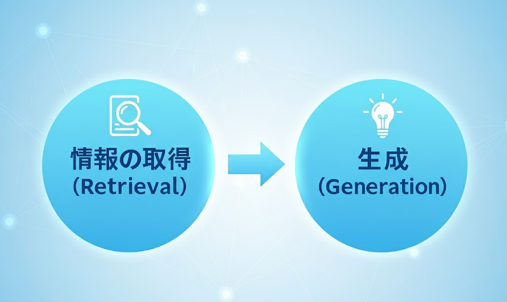 RAGは、「情報の取得(Retrieval)」と「生成(Generation)」という2つのステップを組み合わせた、AIの賢い回答を生み出すための技術です。
