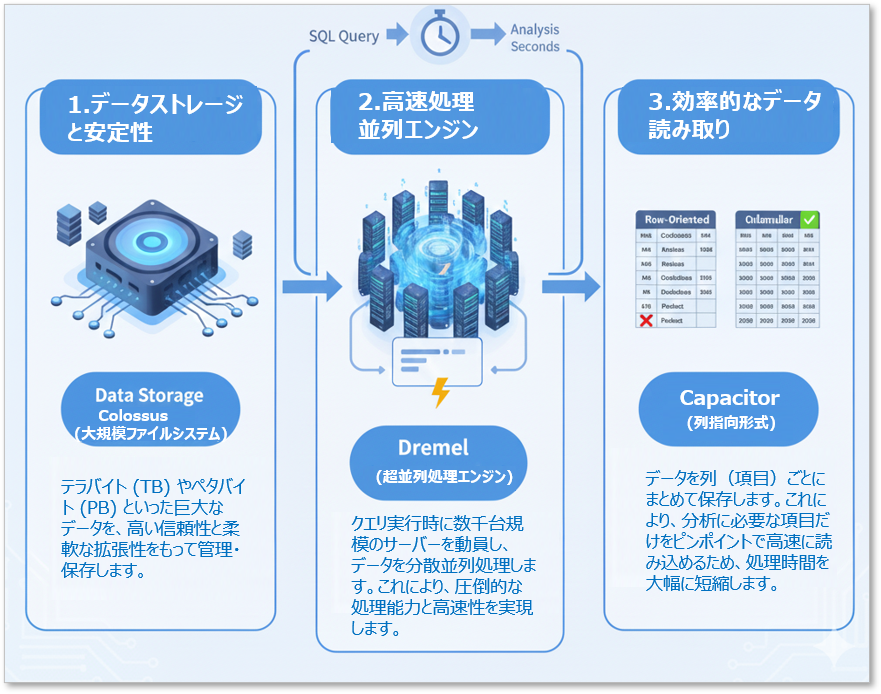 分析対象のデータは、Googleの大規模分散ファイルシステム「Colossus(コロッサス)」で管理されています。これにより、テラバイトやペタバイトといった巨大なデータでも、高い信頼性と柔軟な拡張性を両立させて保存・管理することが可能です